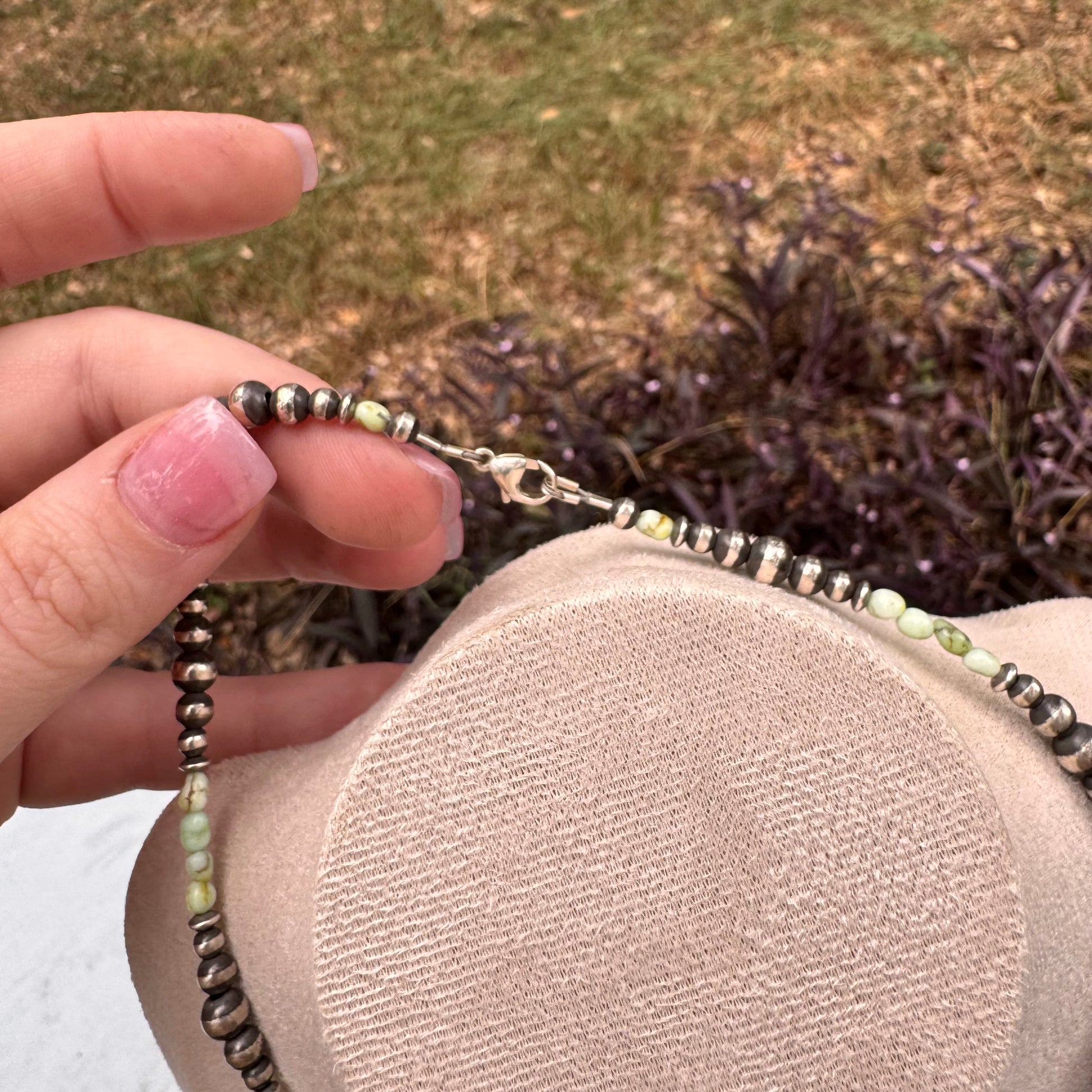 Palamino beads with sterling silver pearls graduating in size 3-5mm, lobster claw clasp.